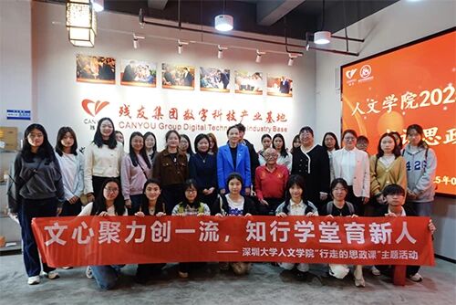 On March 21, Yi Ling, Party Secretary of the School of Humanities at Shenzhen University, led over 40 faculty members and students to visit the Futian Digital Technology Industrial Base of Shenzhen Canyou Group. As part of the “first ideological course” in the form of a mobile learning experience, the delegation gained on-site insight into Canyou Group's dedication to hard work, public welfare, and technological innovation. The visit aimed to explore how technology can empower the development of the humanities.
