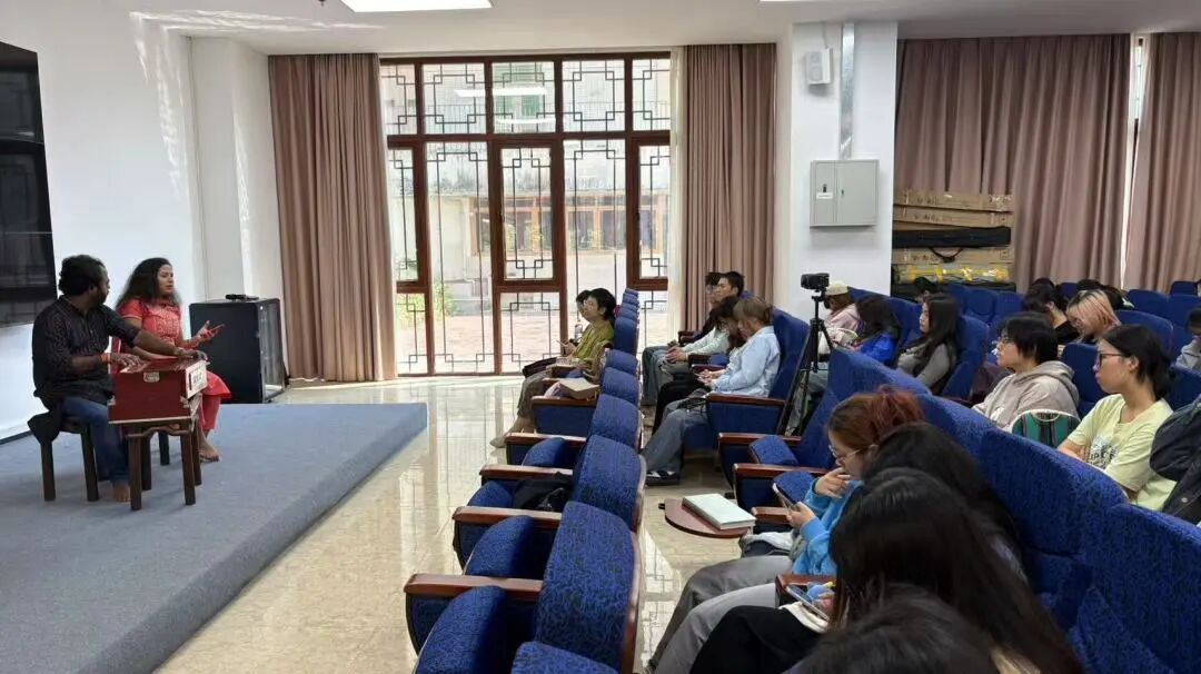On March 21, 2025, the "Echoes of Sanskrit" Indian classical music performance was successfully held in the lecture hall of the Institute of Chinese Classics at Shenzhen University’s Huiwen Building. Nearly one hundred faculty members and students attended the event, enjoying an immersive experience of traditional Indian music.