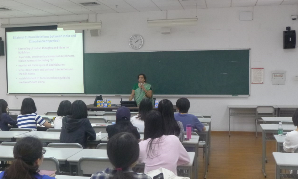 在古代方面,舒明经教授着重介绍了佛教传播这一连接两大文明古国的纽带,她特别提到法显和玄奘两位高僧,高度赞扬了他们不畏艰辛、长途跋涉去往印度求取佛教经典的事迹,以及在促进两国文化交流上做出的伟大贡献。接着,舒教授援引了相关古籍来说明古代中印两国的文化交往和经贸往来,如印度两大史诗《摩诃婆罗多》和《罗摩衍那》中记载的有关一群中国人守护圣人Vashishta和他的神牛故事,以及国王Dhritrashtra在迎接印度神黑天的礼物中提及了产自中国的一千张鹿皮,印度古籍Arthashatra中则记载,中国丝绸在当时被称为“chinamsuka”,中国丝绸做成的衣服称为“chinapatta”,瓷器被称为“chinimitti”(chini=china,mitti=mud/soil),糖则直接称为“chini”等等。