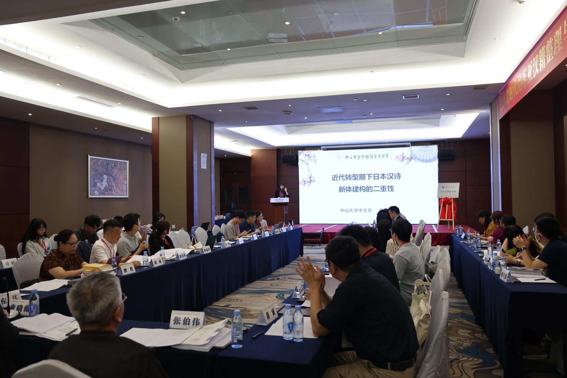 第一单元“日越专场”由深圳大学童晓薇教授主持。佛山大学严艳教授梳理了学界在研究中对越南“北使”一词的认识与使用,指出“北使”一词不仅是地域方位的指称,更体现越南民族主义影响下的独特内涵。深圳大学高伟研究员讨论了日本近世学者对《论语》“子欲居九夷”的演绎,他们将“九夷说”中透露的华夷观念对儒家的“德”进行了替读,皇之“德”与行为的道德属性无关,而与日本神话中天皇一系所继承的“神统”有关。中山大学张奕琳副教授提出明治前期汉诗之新变风潮和其时社会一样呈现出“旧”中 求“变”,“变”中守“旧”的趋新与守旧的二重性。中山大学邹双双副教授究明《中国传说集》翻译出版的详细原委,探讨其与戴遂良《近世中国民间故事》之间的关系,以此个案探索中国志怪小说在日本传播史上的多重影响因素。广东省立中山图书馆孙笛庐馆员以东京大学“一览”与“年报”间的差异为中心,讨论1885年东京大学汉学课程改正,认为当年汉文学课程的变革已基本确立日本中国学的研究框架。深圳大学周萌副教授总结了近藤元粹评点《冷斋夜话》采用的沿用与深化、化用与拓展、反用与重构、拒用与批判四种路径,大致涵盖了同质异形类诗学接受的主流模式,展现出中国传统诗学观念在异域的延伸、演进、变异与衍生。