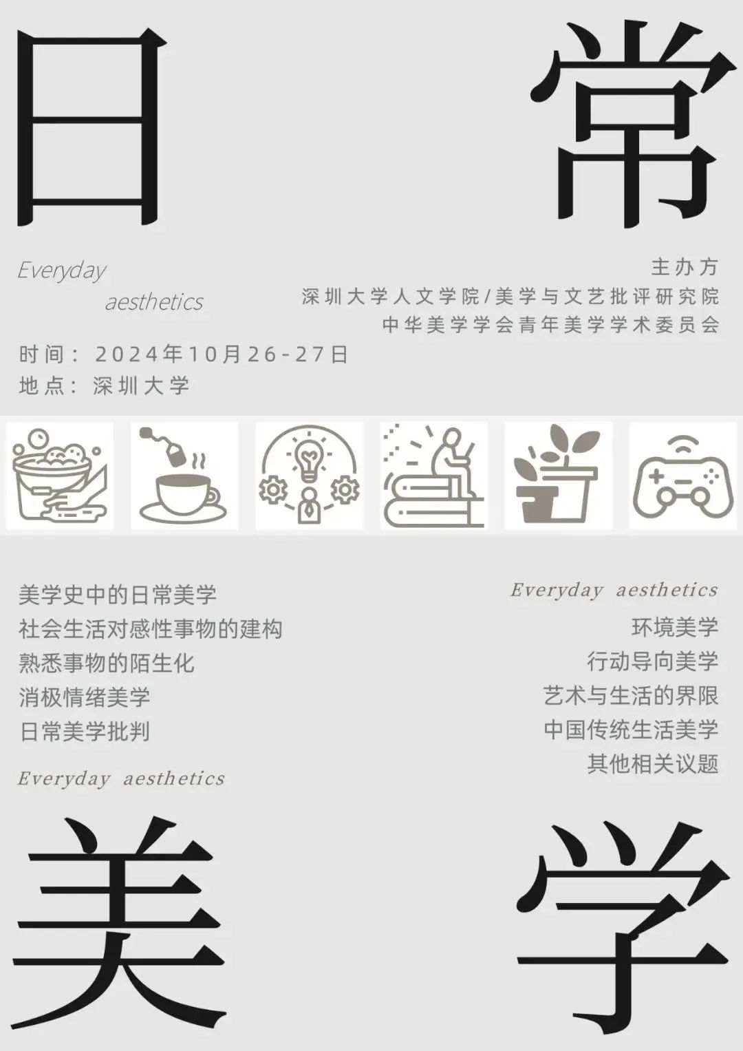 2024年10月26日至27日,由深圳大学人文学院、美学与文艺批评研究院、中华美学学会青年美学学术委员会联合主办的“日常美学”青年美学前沿论坛在深圳顺利召开。本次会议从2024年1月开始发布征文,共收到投稿328篇,“青美会”委员们从中遴选出32篇论文进入大会发言,发言人来自北京大学、清华大学、复旦大学、中山大学等知名高校的优秀学者。