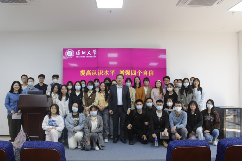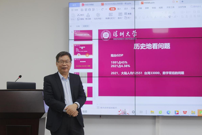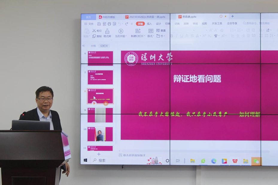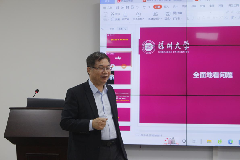 2023年3月3日上午,深圳大学人文学院在国学院报告厅开展“院长思政第一课”,人文学院院长沈金浩围绕“提高认识水平 增强四个自信”的主题为研究生党支部全体党员讲授“思政第一课”。