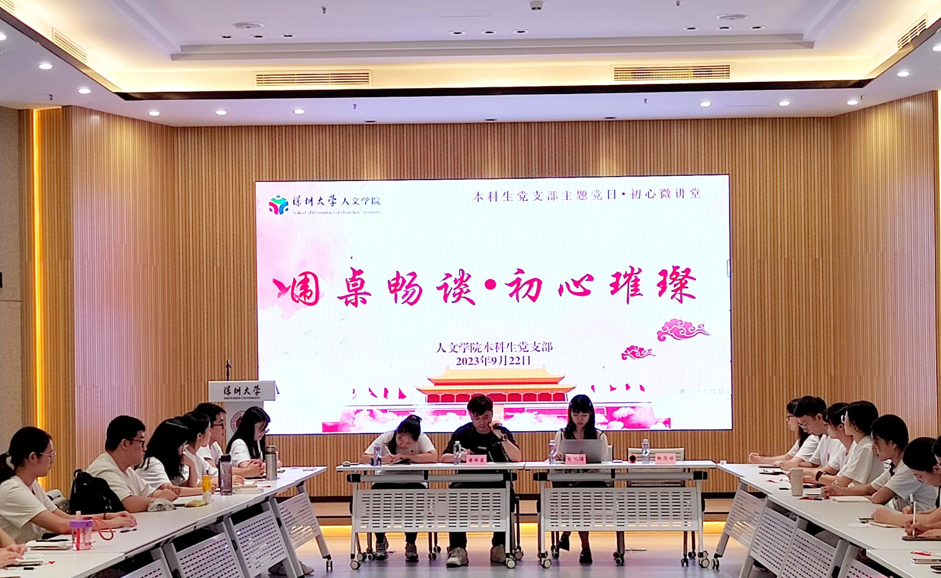 为全面贯彻落实党的二十大精神,深入学习习近平新时代中国特色社会主义思想,喜迎深圳大学建校40周年,2023年9月22日下午,人文学院本科生党支部举办主题党日•初心微讲堂(第1期)活动,邀请了人文学院优秀校友黄泽霖、俞佩洁作为主讲嘉宾,与大家围桌畅谈,为同学们讲述大学成长之路上的初心故事以及择业经验。人文学院本科生党支部书记韩蔼婷老师以及人文学院本科生党支部党员、发展对象、入党积极分子等共40余人参与本次活动。