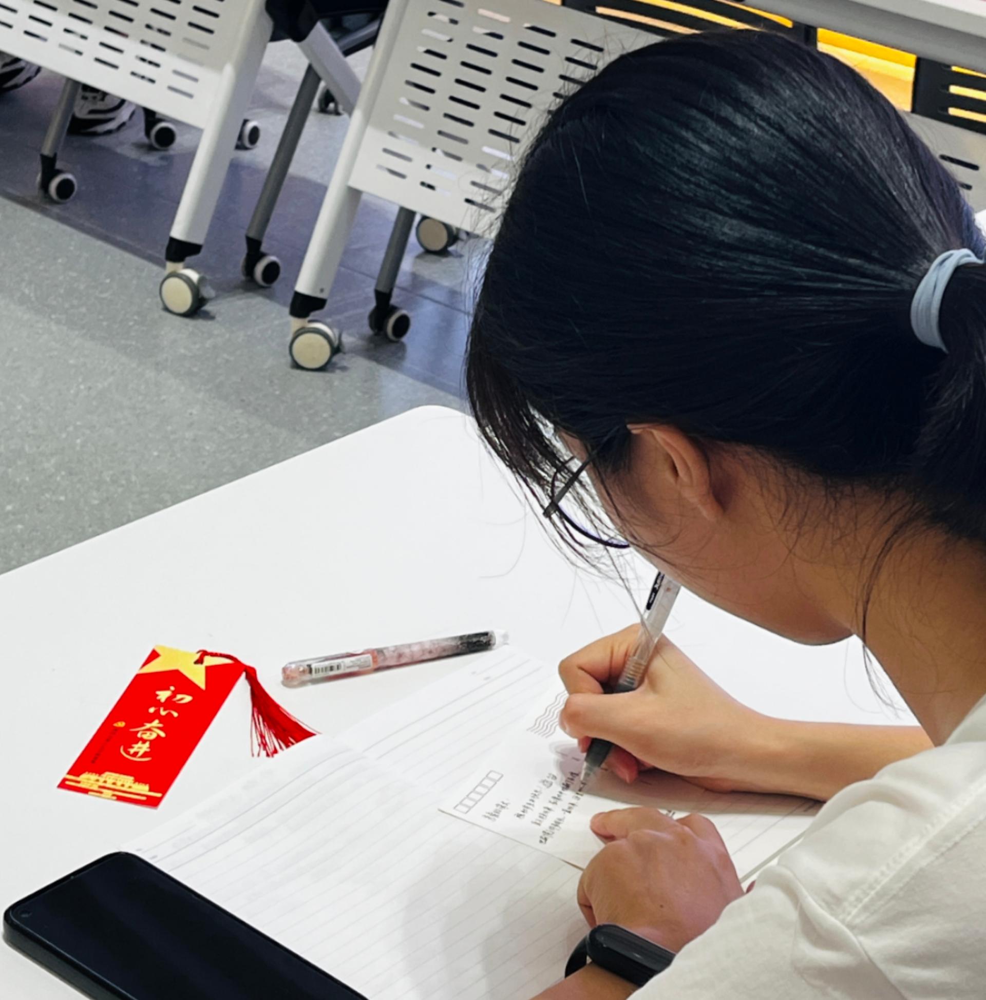 除了畅谈之外,人文学院本科生党支部还在本次微讲堂活动中加入了“我手写我心·共话荔园情”环节,现场工作人员给每位同学发放深圳大学文创明信片,同学们在明信片上写下自己与荔园相关的或者此刻最想对荔园说的话,并分享这段文字背后的故事,以此方式来表达同学们对于深圳大学成立四十周年的祝福。刘语桐同学通过她与人文学院党支部吉祥物“小荔”的相遇,向同学们分享了她与文院本科生党支部的故事,从踏入荔园到与支部共成长,是一段难忘且珍贵的经历;林心彦同学结合深圳大学40周年校庆为荔园写诗,诗歌中字字句句都饱含林同学对于荔园的爱,也充满了她作为一名深大人的自豪和骄傲。