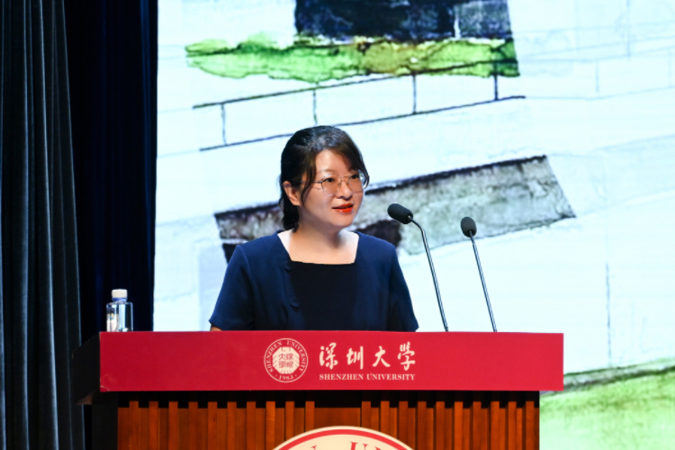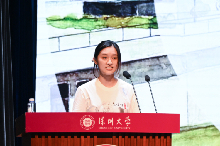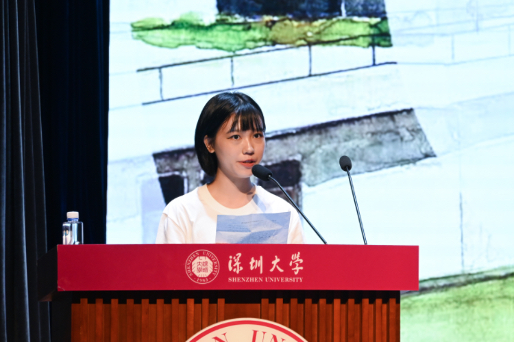 2023级中国语言文学类专业本科生杨焕林作为本科新生代表发言。她表示深圳大学建校四十周年以来,深大人始终秉持着“自立、自律、自强”的校训脚踏实地、锐意进取,取得了许多令人骄傲的成就。在这样一个拥有着无数可能的大学,同学们何不带吴钩,提椽笔,燃新火,试新茶?大胆追逐热爱,全力以赴,满载而归。