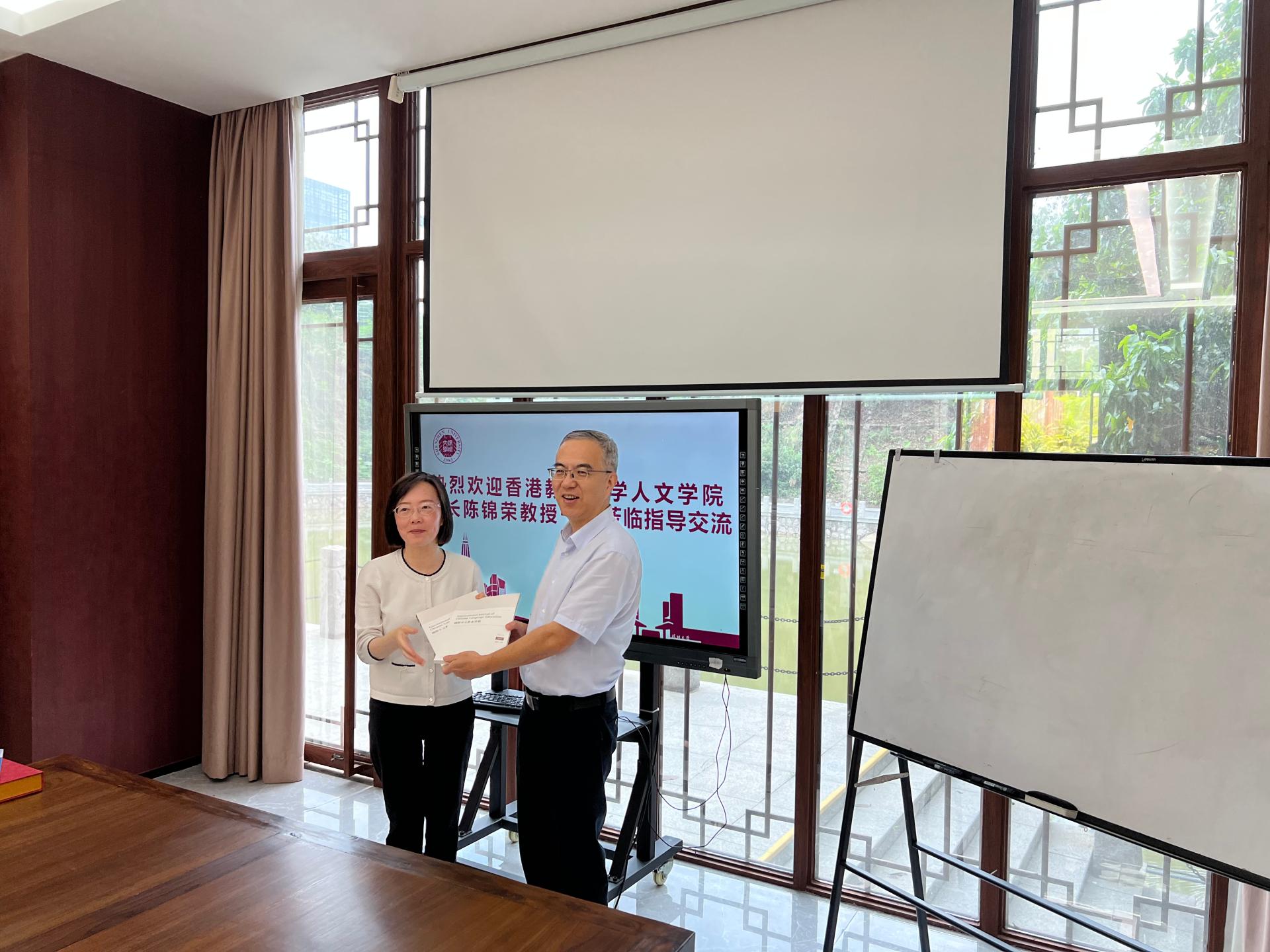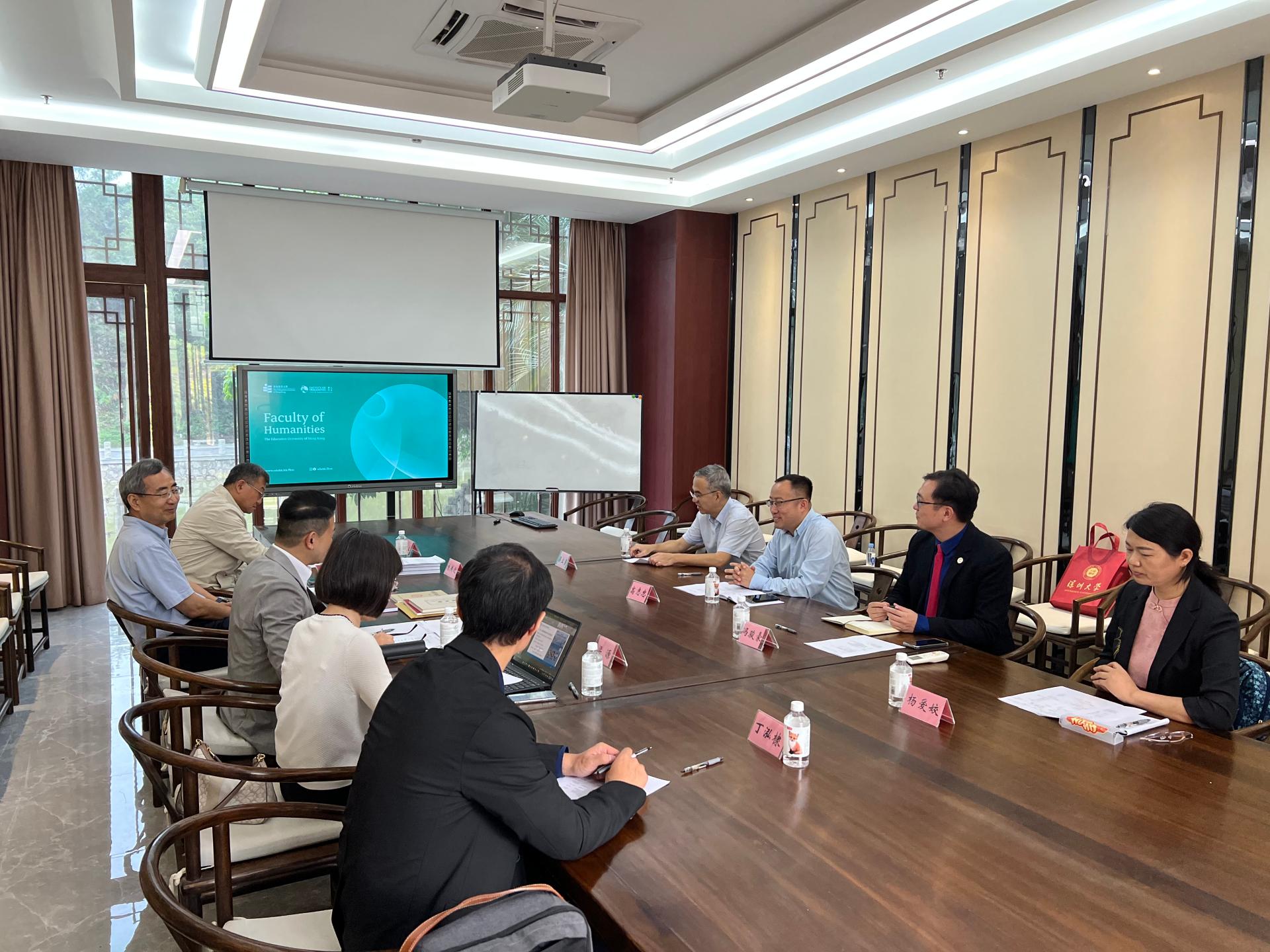 2024年4月22日上午,深圳大学人文学院与香港教育大学人文学院院长陈锦荣教授一行交流合作会议在深圳大学国学院会议厅顺利举行。香港教育大学人文学院院长陈锦荣教授、香港教育大学中国语言及中文教育研究中心总监朱庆之教授、「粤港澳高校汉语言教育联盟」主任梁源副教授,香港教育大学中国语言学系助理教授丁泓棣、「粤港澳高校汉语言教育联盟」秘书周立先生出席了会议。深圳大学人文学院副院长高志忠、副院长梁立勇、副院长冯骏豪、杨爱姣教授出席交流合作会议。
