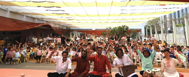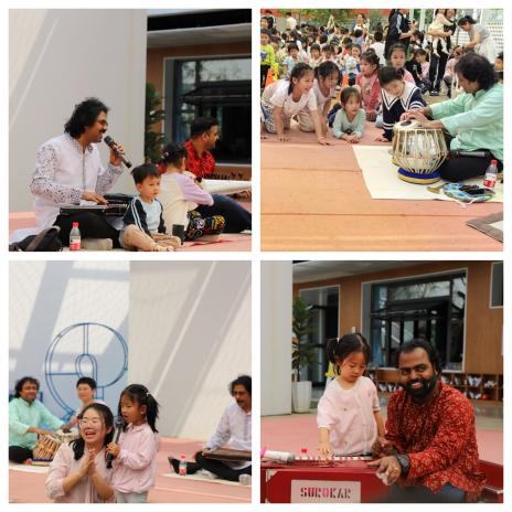 4月10日上午九点半,应深圳大学附属南山幼儿园的邀请,音乐家们来到校内的幼儿园。音乐家们刚踏入幼儿园大门,就听到操场上坐在椅子上的全院小朋友热情的欢呼声。四位音乐家欣喜万分,他们在操场舞台席地而坐,高举双臂与热情的小朋友们不断挥手。幼儿园老师主持,随后印度研究中心朱璇老师给小朋友们介绍了故事《西游记》里的“西天”就是“印度”,逐一介绍每位音乐家及他们的乐器,介绍至Sarod琴时,斯密特•特瓦里还即兴弹起了“圣诞歌”,令小朋友们兴奋不已。演出正式开始,四位音乐家先吟唱了一曲鸟鸣的歌,随后教小朋友们跟着吟唱,继而又表演了一曲彩色霍利节的歌曲。蒙一班全体小朋友表演一首中国歌曲。最后,小朋友代表上台尝试触摸与击打乐器,他们对每一种乐器都充满了无限好奇。活动最后,全园小朋友们一起唱诵园歌,音乐家们用乐器伴奏。蒙一班班主任江慧玲老师代表幼儿园,向音乐家们赠送幼儿园文创作为礼物,并感谢他们远道而来,给中国小朋友们带来精彩的音乐演出。