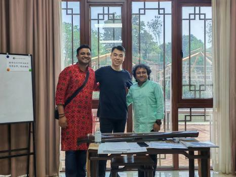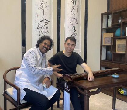 4月10日下午三点,在朱璇老师的引领下,基金会负责人与四位音乐家来到人文学院国学院,与古琴演奏家马骁老师一同品茶、听曲。马老师是非遗项目传承人、深圳市古琴协会副会长和深圳大学古琴研究中心执行主任。热聊之后,他演奏一曲《酒狂》,引得苏普里亚•杜塔阵阵惊叹,多番探讨。斯密特•特瓦里和比瓦卡尔•乔杜里随着古琴乐曲,也即兴创作,三人同奏,不亦乐乎。