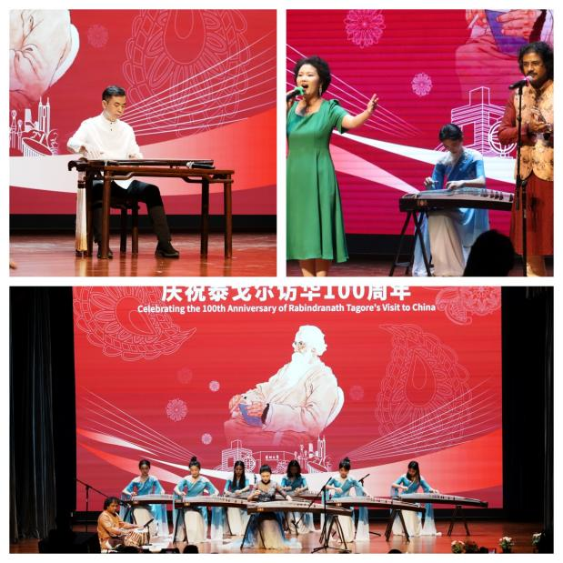 外交部亚洲司张亮参赞在致辞中说,100年前的4月12日,也就是今天,泰戈尔一踏上中国的土地,他就感到十分亲切。他说,中印两国的山脉说着相同的语言,两国的湖泊带着同样妩媚的笑容。泰戈尔正是怀着这种对中国特殊的友好感情,访问了中国,开启了中印友好交往史上的一次里程碑事件。100年来,中印关系有过起伏,但友好合作始终是主流。尽管当前中印关系面临一些困难,中方始终从战略高度和长远角度看待中印关系,始终认为两国有着广泛共同利益和巨大合作潜力,一直致力于推动双边关系回归健康稳定发展轨 道。今年是和平共处五项原则发表70周年。2014年,特地为国际大学中国学院颁发了和平共处五项原则友谊奖。我相信,印度朋友今天重走泰戈尔之路,他们一定会带动青年一代传承泰戈尔对中国的深厚情谊,续写中印友好合作的新篇章。音乐是凝聚情感的河流,也是超越国界的语言。泰戈尔曾说过,世界用图画和我说话,我的灵魂答之以音乐。不管是何种艺术形式,不管何种文明形态,人与人的美好心灵是共通的。我也期待着中印的音乐家把中国音乐和印度音乐融合在一起,让我感受到中印文明交流互鉴的美妙,恰如今天的主题美美与共,这也一定程度上契合了中华民族主张的天下大同与印度人民追求的世界一家理念。