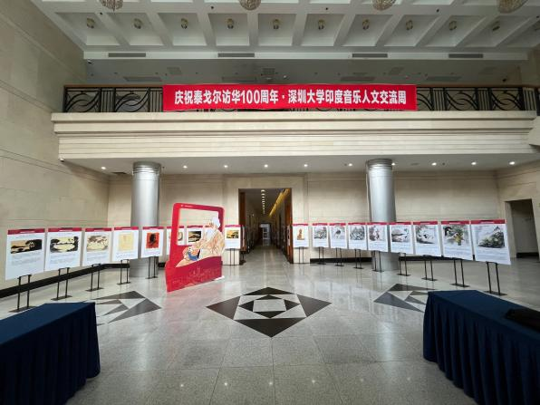 音乐会开始前,国际会议厅大厅里摆满了泰戈尔画作、岭南著名画家蔡立群先生赴印的画作,以及二十年来深圳大学举办的泰戈尔讲座、画展、征文比赛、泰戈尔铜像摄影比赛等近五十幅照片实景,堪为小型“泰戈尔与深圳大学”展览。国际会议厅大厅还摆放着巨型喷绘的徐悲鸿绘泰戈尔半身坐像照片框,供来宾与画作中的“泰戈尔”合影留念。