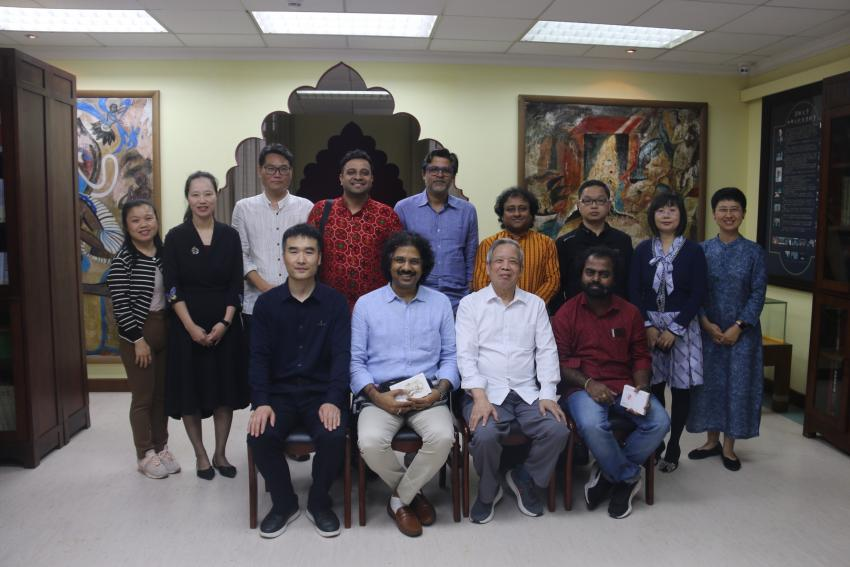 4月9日下午三点,深圳大学印度研究中心全体成员与查谛艺术基金会负责人和四位音乐家在谭云山中印友谊馆会面并交谈。印度音乐家表示非常喜欢与中国音乐的互动和合作,他们发现中印音乐很多共通之处,希望能多开展与中国音乐的交流。中心主任郁龙余教授给每位来宾赠送了由《深圳赋》作者陈健和《鹏城锦绣》画家魏克丹制作的十连张明信片。参会者还有桂林理工学院李鹏副教授、广安市政府港澳与外事办公室罗伟韬副主任等来宾。