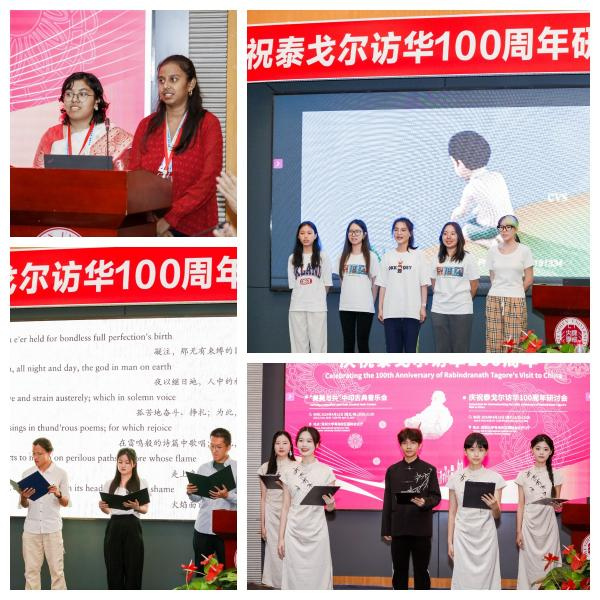 学生展演环节,上海政法学院 “汉语桥”印度学生用孟语和中文朗诵了泰戈尔诗歌《心无所惧》(Chitto Jetha Bhayshunyo);来自公选课“泰戈尔与印度文学”的八名本科生演唱印地语歌谣《小鱼是水中女王》(Machli Jal Ki Rani Hai);来自人文学院哲学系和比较文学与世界文学系的三位研究生用英文朗诵了泰戈尔诗歌《致敬奥罗宾多》(Namashkar to Aurobindo);公选课“印度视觉艺术”的五名本科生身着旗袍和中山装,用中文朗诵了泰戈尔诗歌《生如夏花》。