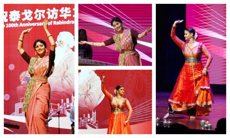 音乐会接近尾声,观众们欣赏了由印度著名舞蹈家Narmrata Rai表演的印度卡塔克古典舞蹈、由音乐家Manoj Murali和泰戈尔家族后裔、著名婆罗多舞者和泰戈尔舞者舒日嘉(Souraja Tagore)表演的泰戈尔诗歌唱诵和舞蹈,步伐翩翩、舞姿曼妙、情感细腻,赢得了现场观众的阵阵掌声。
