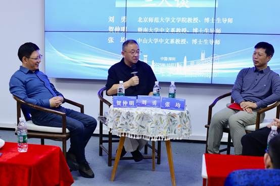 本次会议在10月31日晚特别策划了“青年学者与中国文学三人谈”活动。当晚,由深圳大学人文学院副教授周俊锋主持,三位主讲嘉宾中国现代文学研究会会长、北京师范大学教授刘勇,暨南大学教授贺仲明及中山大学教授张均分别结合个人经验与学术体会,就青年学者的研究方向、方法与学术心态进行了深入交流。