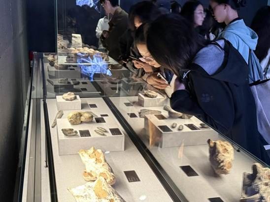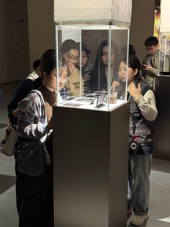 接着,成员们移步到“奇趣博物号:星尘、奇珍、交辉之路——跨文明古代艺术与数字艺术综合展”。该展览融合古代艺术与数字科技,呈现跨文明交流的历史轨迹与艺术结晶。馆内展品丰富多元:从见证生命起源的远古动植物化石,到承载着两河文明与古埃及人精神世界的权力印章;从古印度充满哲思的彩陶与雕塑,到源远流长的华夏农耕文明佐证与祭祀礼器;从丝绸之路的文物遗存,到当代数字艺术的再创造,党员们在古今对话中感受中华文明兼容并蓄的包容力与生生不息的创新力。