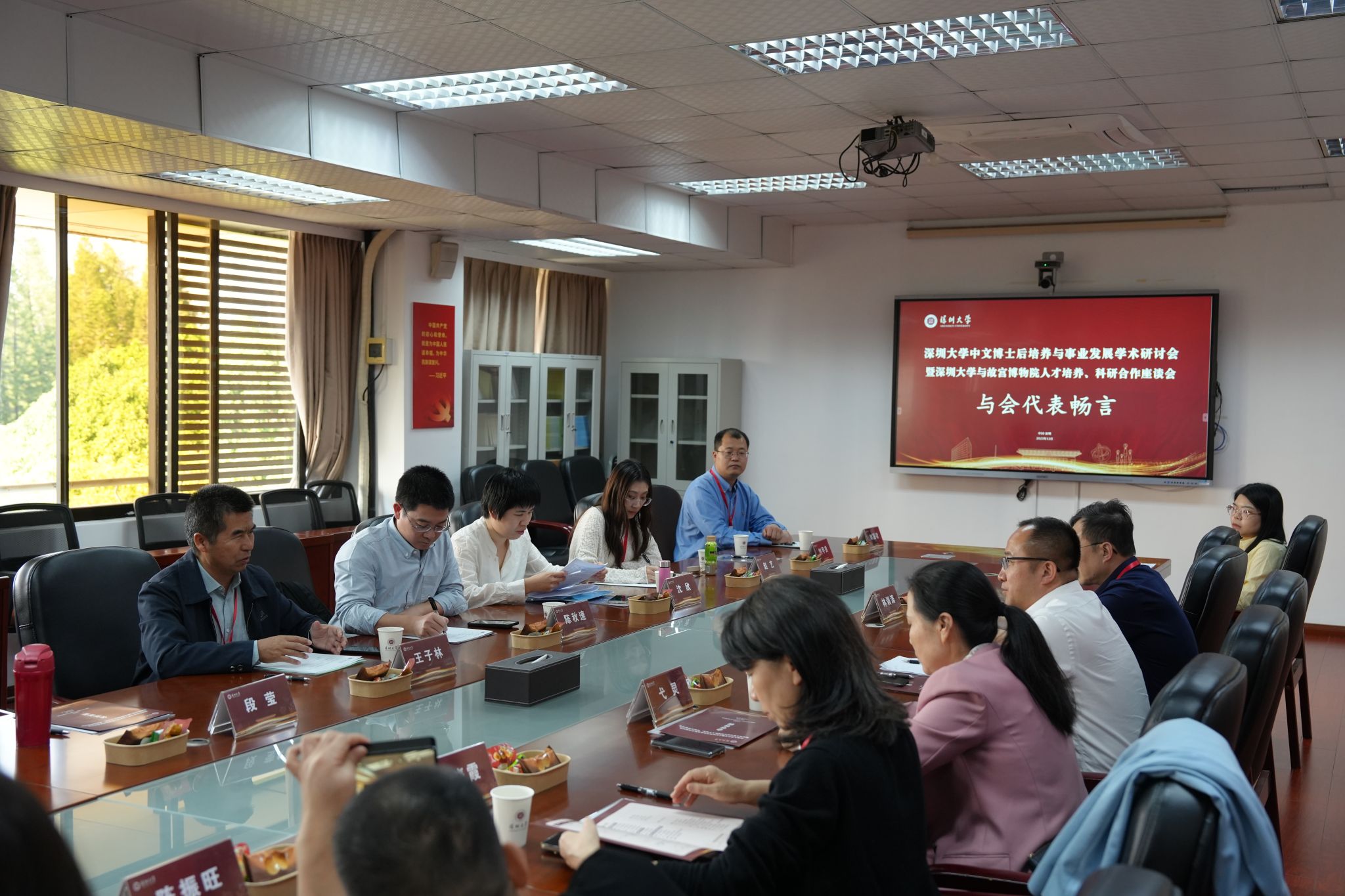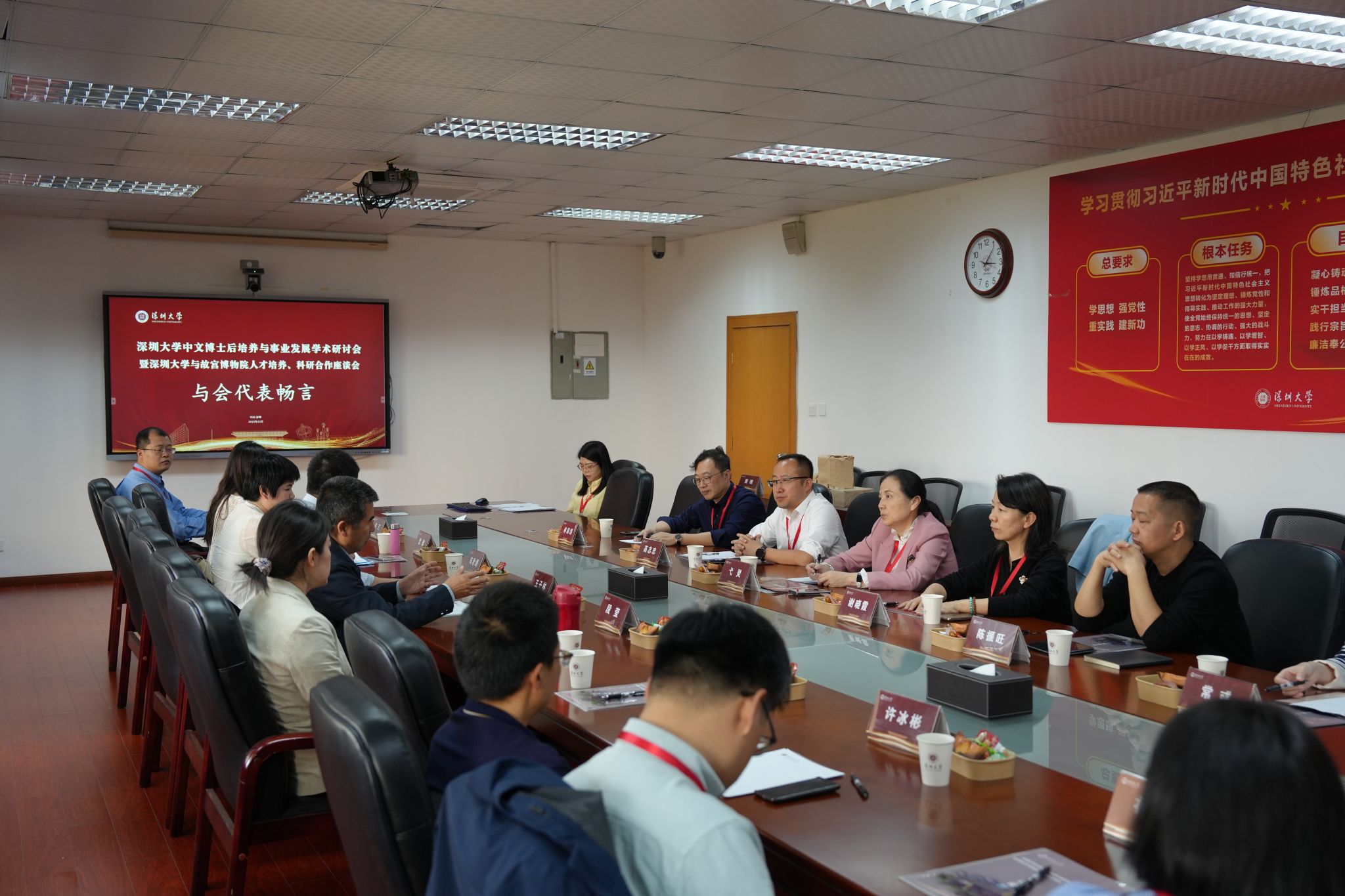 故宫博物院故宫学研究院执行院长王子林、科研处处长陈秋速率队,与中国人民大学国家发展与战略研究院研究员、交叉科学研究院副院长、国家治理大数据和人工智能创新平台主任龚新奇,深圳博物馆馆长黄琛,深圳美术馆馆长朱建军等14位专家、学者,以及深圳大学党委副书记吴报水、人力资源部主任高颖、研究生院院长刘永、社会科学部主任曾宪聚、图书馆馆长胡振宁、科学技术发展研究院平台办主任杨钦鹏,人文学院、传播学院、高等研究院、计算机与软件学院、建筑与城市规划学院、人工智能学院、艺术学部等相关学院、研究机构的负责人,齐聚深圳大学汇典楼,围绕博士后人才培养与科研合作展开深入交流。