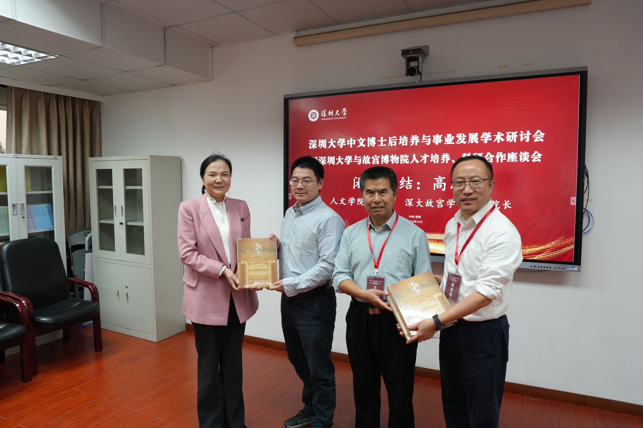 故宫博物院科研处处长陈秋速作闭幕致辞,深圳大学人文学院副院长高志忠作闭幕总结。座谈会结束后,故宫博物院故宫学研究院向深圳大学故宫学研究院捐赠《百年守护》大展图书。