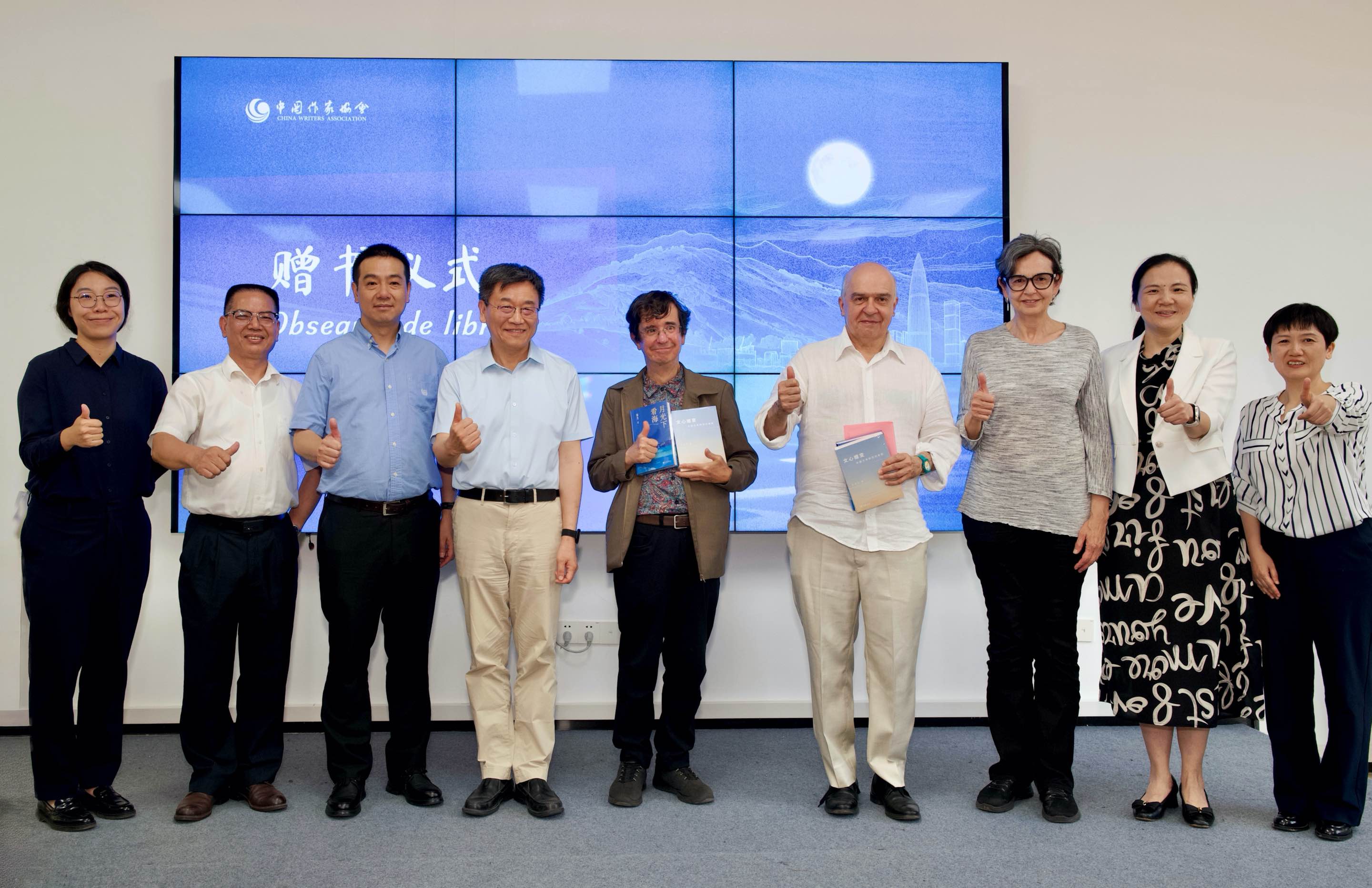 活动伊始,中国作家协会对外联络部副主任郑磊在致辞中指出,拉美文学底蕴深厚,哥伦比亚作为拉美文学重镇,诞生了无数享誉世界的经典,而深圳作为典型的移民城市,其特质与哥伦比亚多元交融的文化底色让两国作家在“他乡与故土”这一话题上拥有天然的共同语言。深圳大学人文学院院长马自力表示,文学是寻找精神故乡的途径,深大人文学院愿为这种跨文化的对话提供持续的学术支持。今天这场学术对话,不仅是中哥两国作家的智慧碰撞,更是一次以文学为桥、连接他乡与故土的精神旅程。随后,现场举行了赠书仪式,深圳大学人文学院向哥伦比亚作家赠送郭杰教授的诗集《月光下看海》和汤奇云教授的新著《文心嬗变——中国文学的范式革新》。